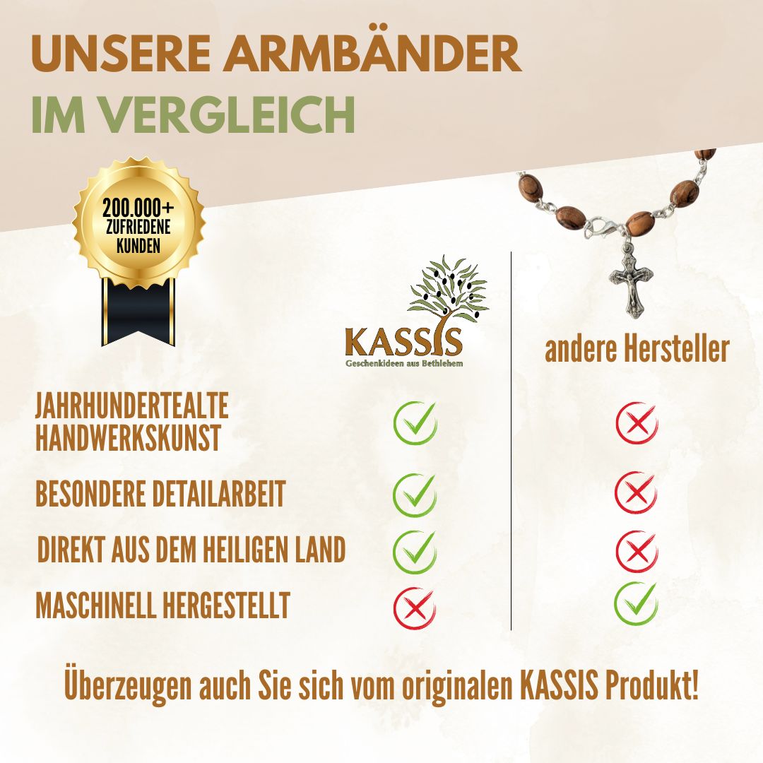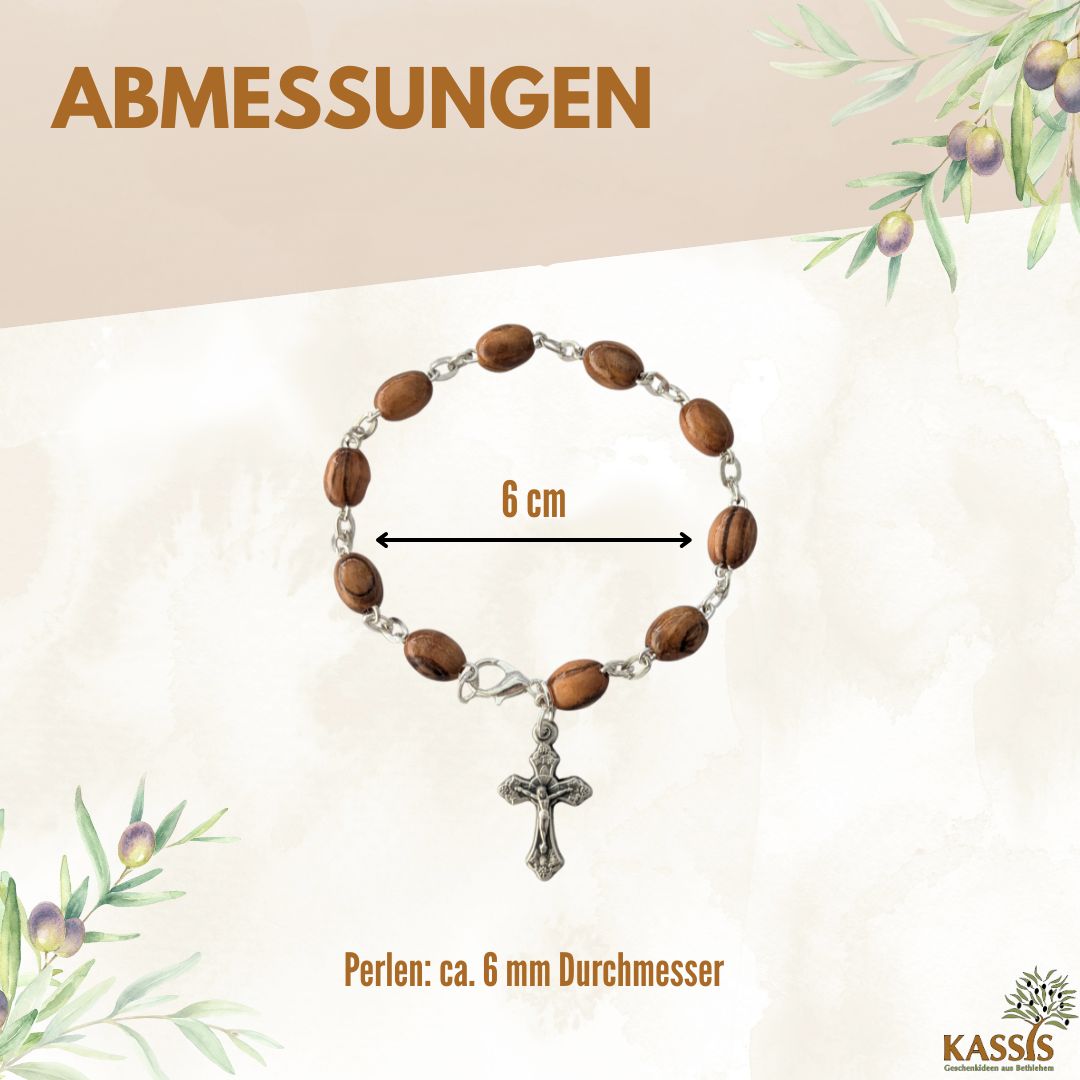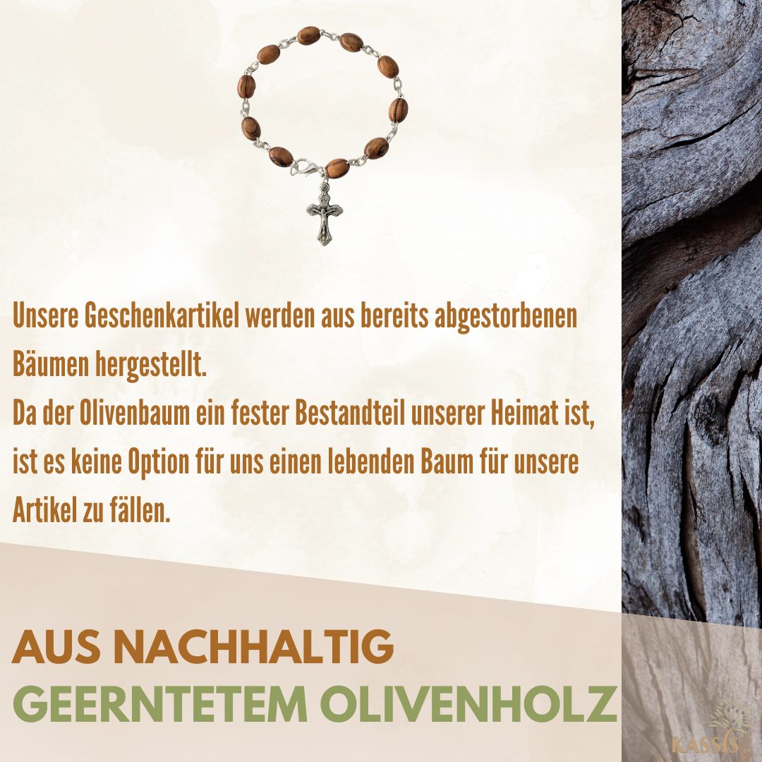 Natürlich, schlicht und bedeutungsvoll – dieses Armband aus ovalen Olivenholz-Perlen wird in Bethlehem liebevoll von Hand gefertigt. Es vereint natürliche Schönheit, handwerkliche Tradition und symbolische Tiefe in einem zeitlosen Schmuckstück, das Glaube und Natur harmonisch verbindet.