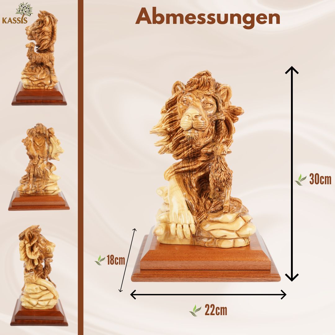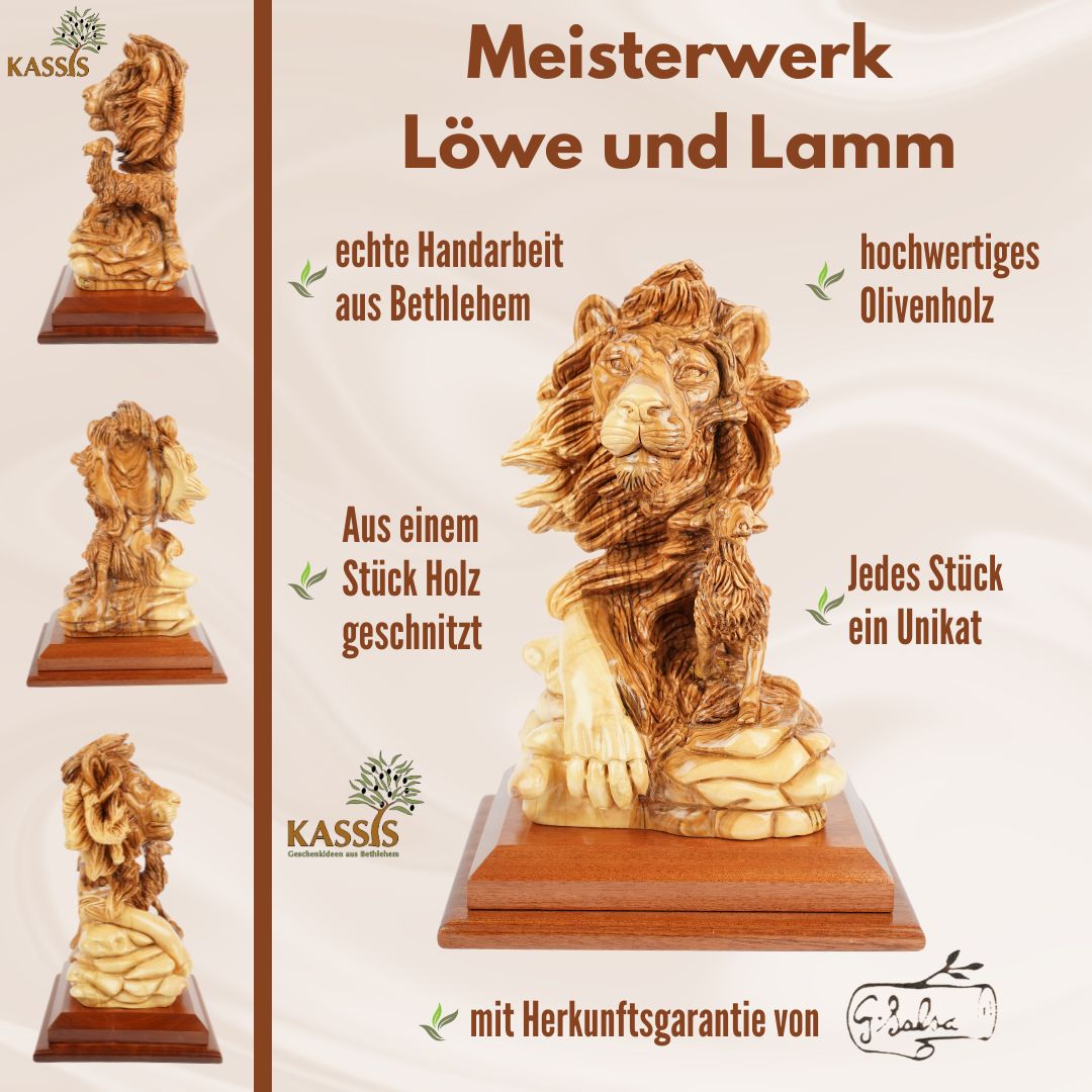 Erfahrene Holzschnitzer aus dem Heiligen Land haben diese Komposition mit außergewöhnlicher Präzision und Tiefe geschaffen – von der kraftvollen Mähne bis zum zarten Fell des Lamms.