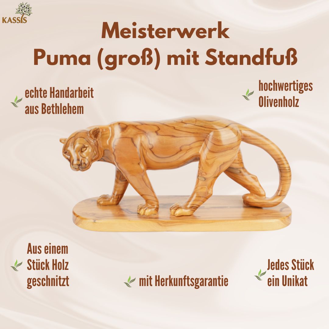 Diese ausdrucksstarke Pumaskulptur wurde in liebevoller Handarbeit aus einem einzigen Stück Olivenholz geschnitzt – in Bethlehem, der Stadt mit einer langen Tradition spiritueller und künstlerischer Holzschnitzkunst.