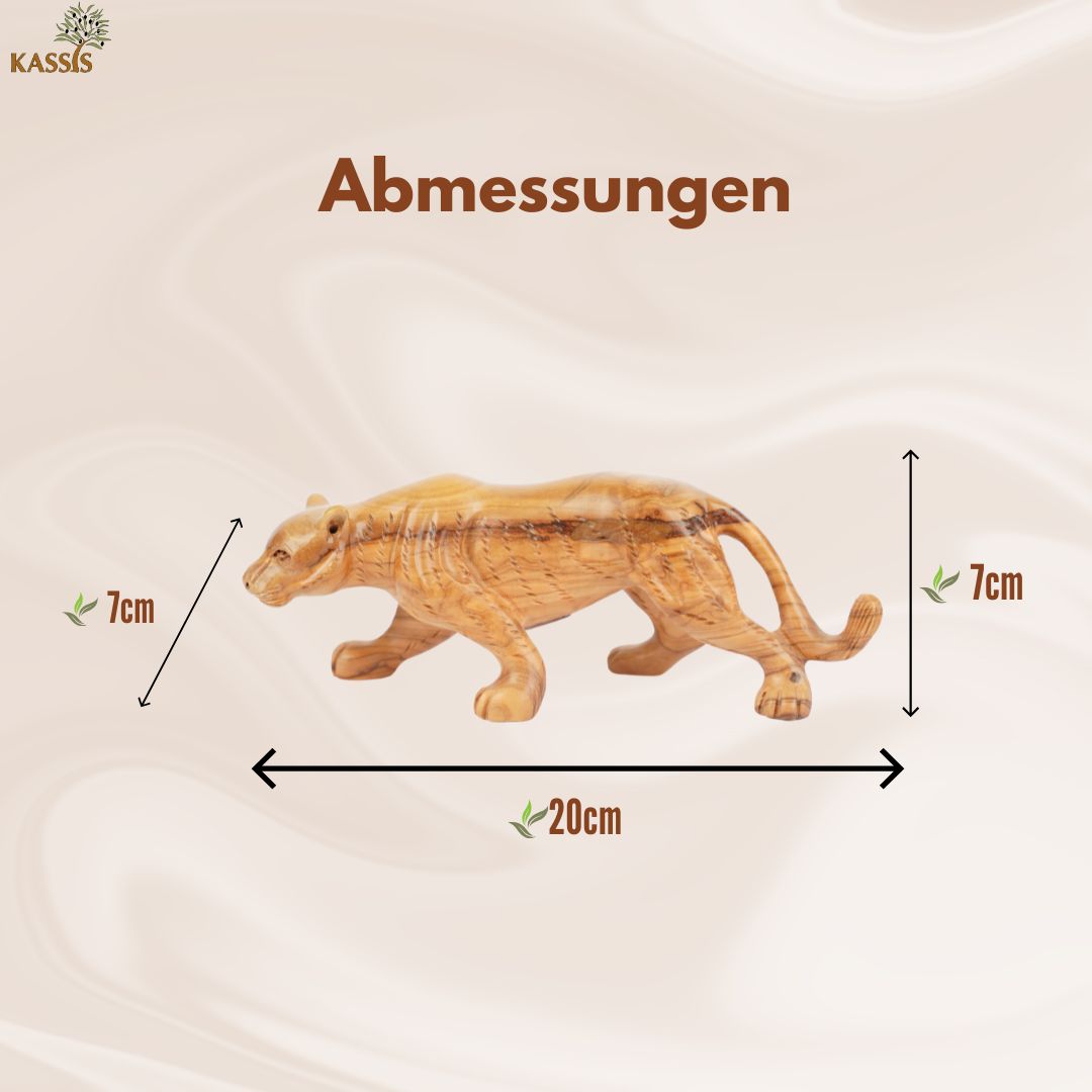 Diese kompakte Pumaskulptur wurde in Bethlehem aus einem Stück Olivenholz mit großer Präzision geschnitzt. Die feinen, handgeschnitzten Linien auf dem Körper betonen Muskeln und Bewegung – als würde das Tier gleich zum Sprung ansetzen.
