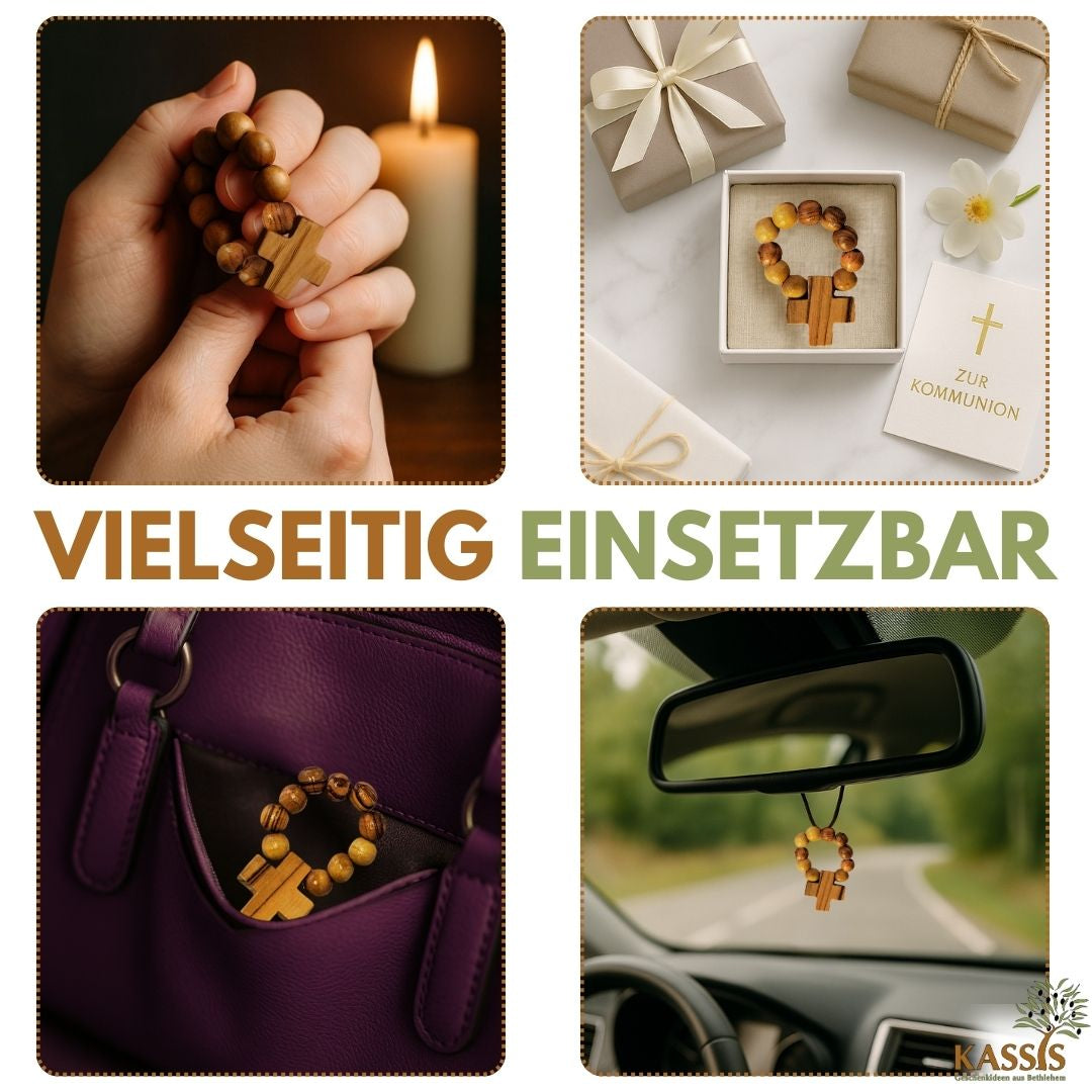 🌿 EIN STÜCK HEILIGES LAND IN IHREN HÄNDEN: Jeder Rosenkranz wird traditionell in Bethlehem gefertigt — der Geburtsstadt Jesu — von Kunsthandwerkern, die ihre Fertigkeiten über Generationen weitergeben. Durch das Olivenholz trägt der Rosenkranz nicht nur seine natürliche Schönheit, sondern auch die Verbundenheit mit der Heimat des Glaubens in sich.