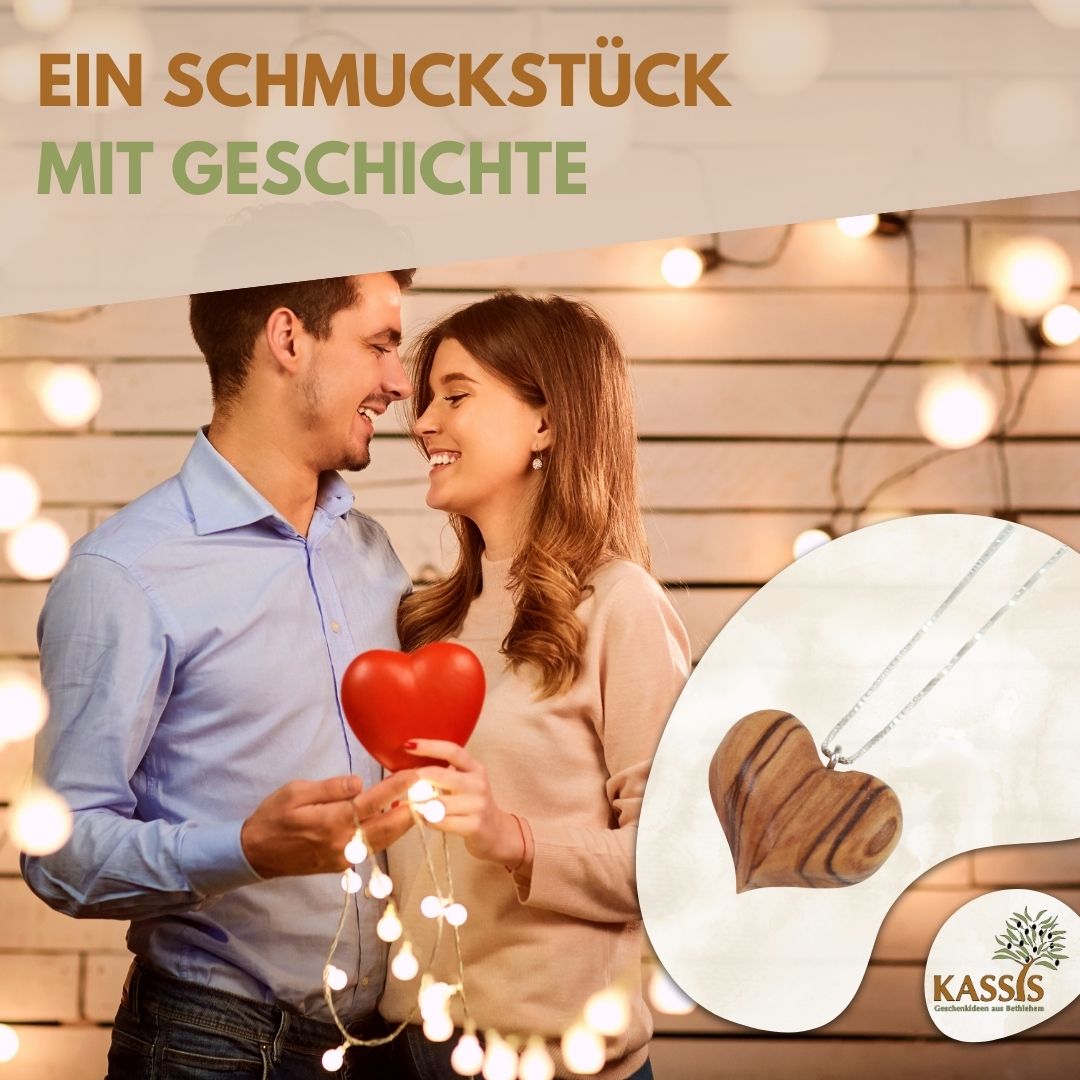 Das Herz aus Olivenholz wurde in Bethlehem von Hand geschnitzt und fein bearbeitet. Es ist ein wunderschönes Geschenk, ein typisches Symbol von Zuneigung, benutzt als Schmuckstück oder Glücksbringer. Egal, ob Geburtstag, Valentinstag oder sonstige Familienfeierlichkeiten, die Halskette aus 925 Silber (nickelfrei) und das Herz mit individueller Maserung machen große Freude.