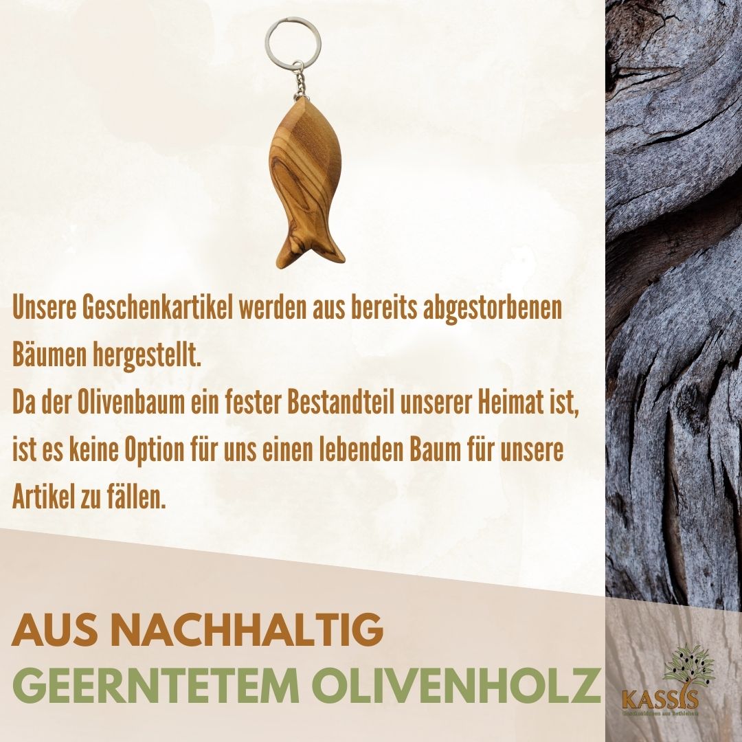 Jeder Anhänger wird in Bethlehem aus echtem Olivenholz gefertigt und sorgfältig von Hand geschliffen. Die individuelle Maserung macht jedes Stück zu einem einzigartigen Unikat.