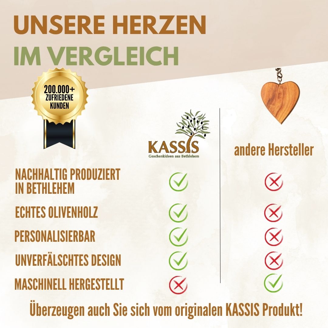 Dieser schlichte, elegante Schlüsselanhänger in Herzform wird in Bethlehem mit großer Sorgfalt von erfahrenen Kunsthandwerkern gefertigt. Er besteht aus echtem Olivenholz, dessen natürliche Maserung jedes Stück zu einem einzigartigen Unikat macht. Durch seine glatte Oberfläche liegt der Anhänger angenehm in der Hand und ist ein stilvoller Begleiter im Alltag – ob am Auto-, Haus- oder Büroschlüssel.