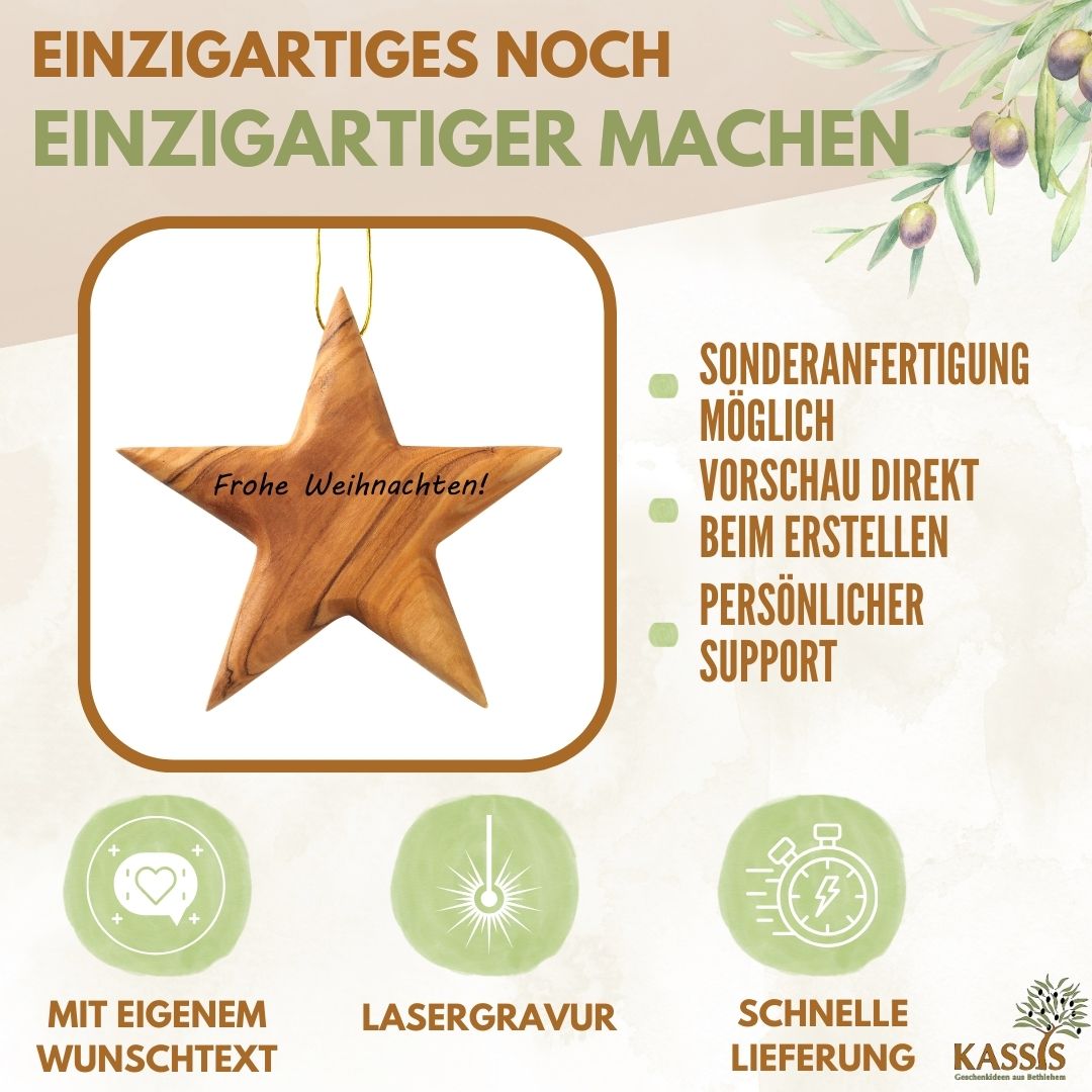 Unser Holzstern wird in aufwändiger Handarbeit in Bethlehem gefertigt. Er ist ideal für Menschen, die ihrer Dekoration gerne einen natürlichen Charme verleihen wollen. Ob zu Weihnachten, einer Winterhochzeit oder als Geschenk für den Adventskalender, der hübsche Stern macht große Freude. Lassen Sie Ihren Stern als besonderen Blickfang mit Ihrem Wunschtext versehen und überreichen Sie ein unvergessliches Geschenk!